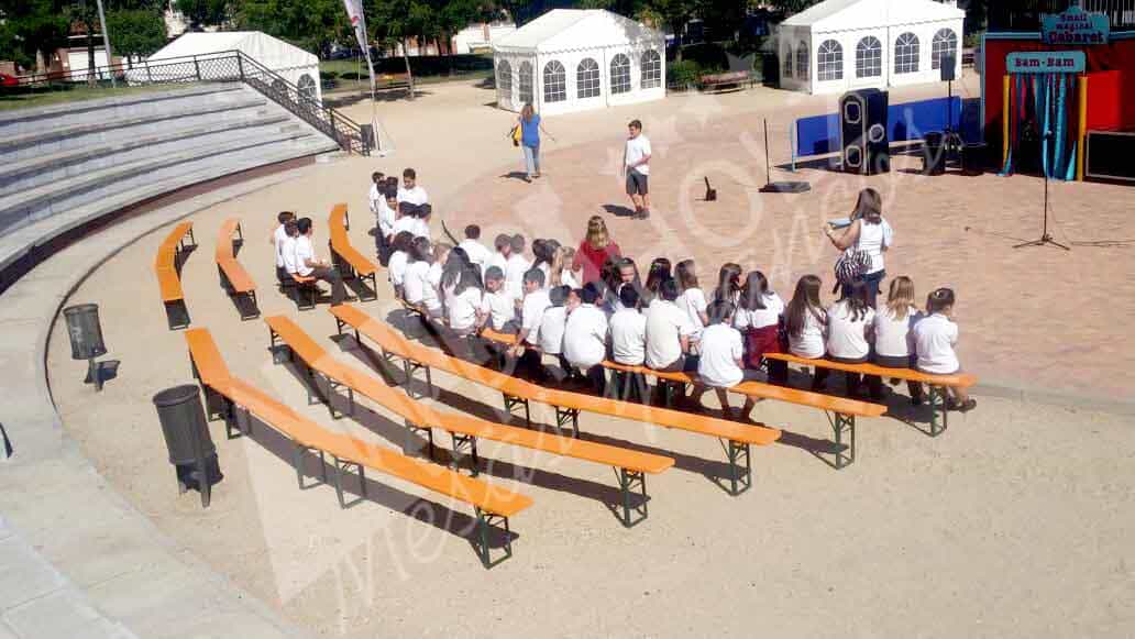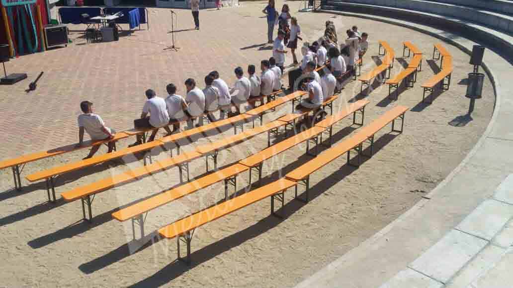 Alquiler de bancos plegables de madera para fiestas, así como eventos culturales o de empresa, teatro, presentaciones, grupos scouts…