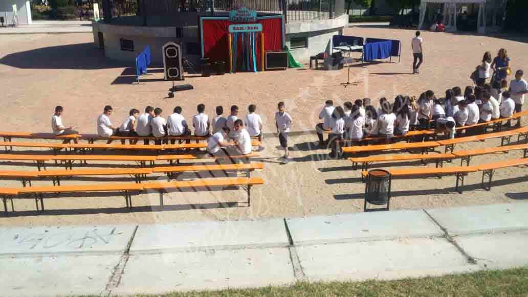 Durante la celebración de estas jornadas culturales para la infancia, ofrecimos acomodo con nuestros bancos plegables de madera de alquiler. El fácil traslado de nuestros bancos posibilita tener sentado la gente en cualquier sitio. Y dependiendo de la afluencia en cada espacio, distribuirlos adecuadamente y separarlos facilitando la distancia social.