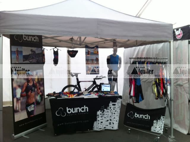 En esta feria deportiva, suministramos esta carpa de 3x3m de alquiler. Nuestro cliente necesitaba una carpa robusta, ya que querían una máxima visibilidad de su producto. Las tijeras de nuestras carpas Premium de alquiler, con 2mm de aluminio de grosor interno, permiten colgar peso sin ningún inconveniente. Además de estar protegidos de la lluvia gracias a nuestras lonas 100% impermeables.