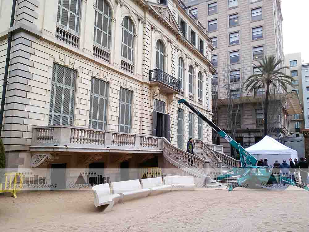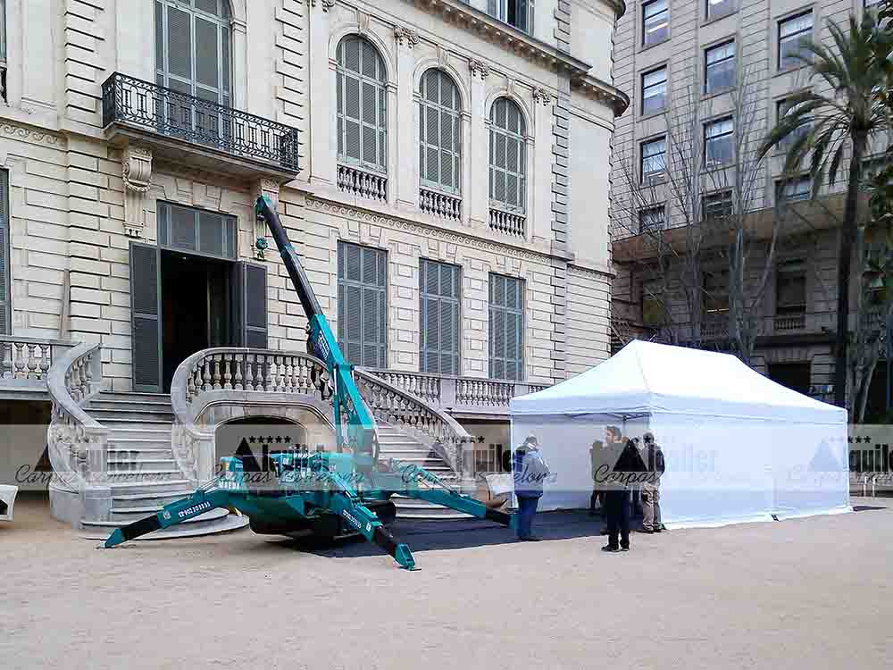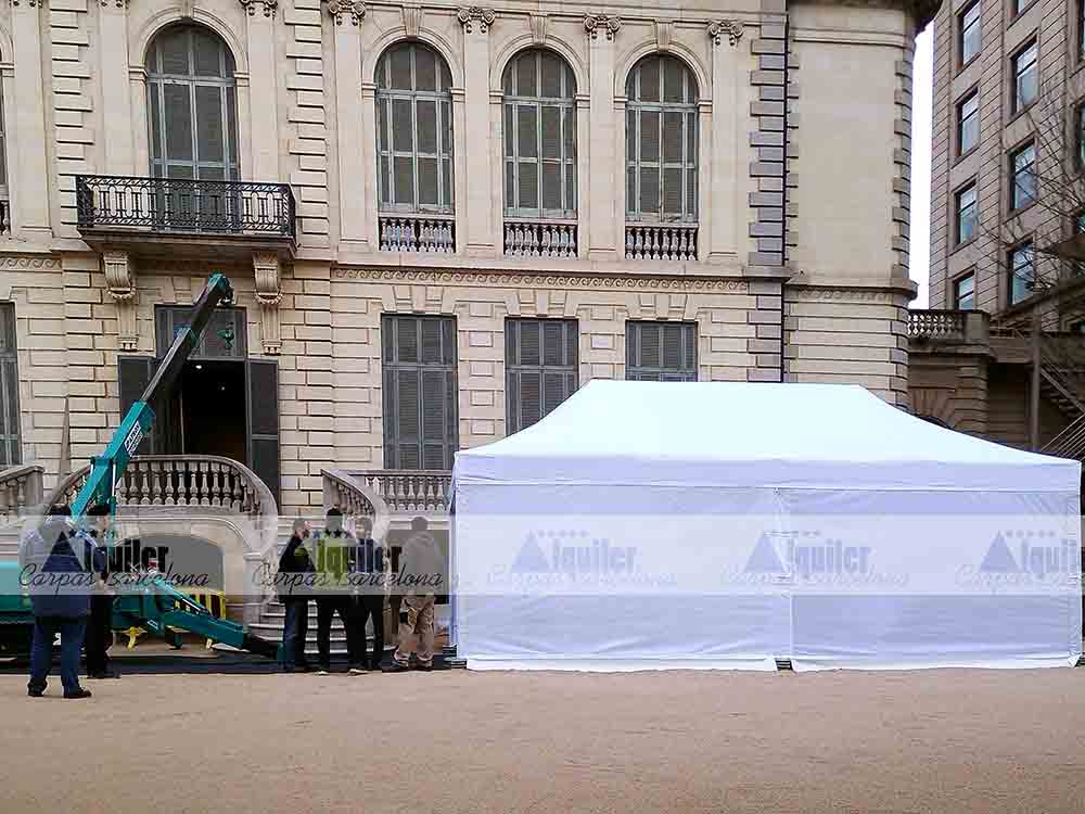 Una de nuestras carpas plegables de 4x8m de alquiler instaladas en el Palau Robert de Barcelona. Usada como carpa para almacenamiento del material para que estuviera protegido de las inclemencias meteorológicas.