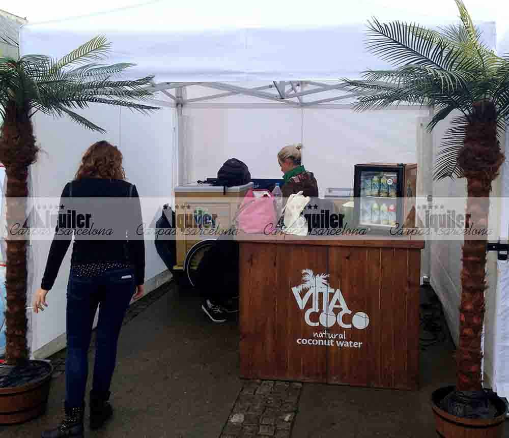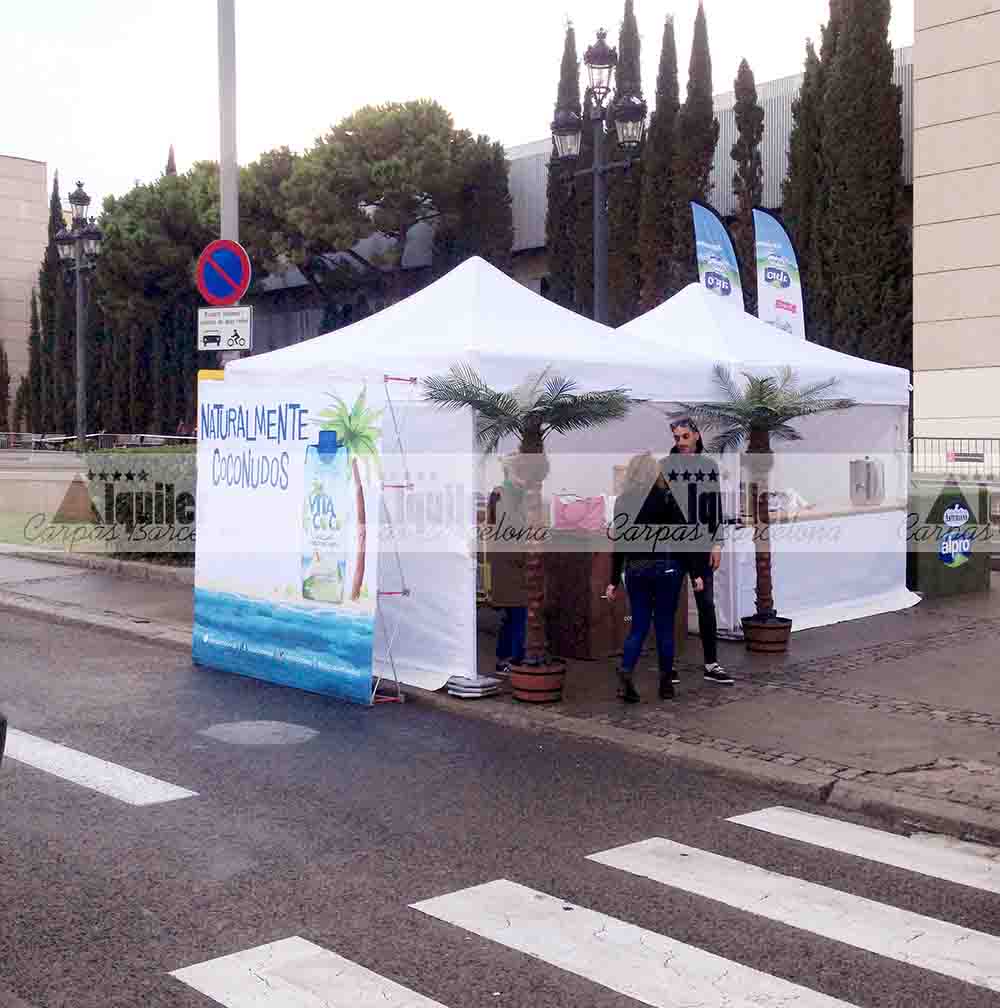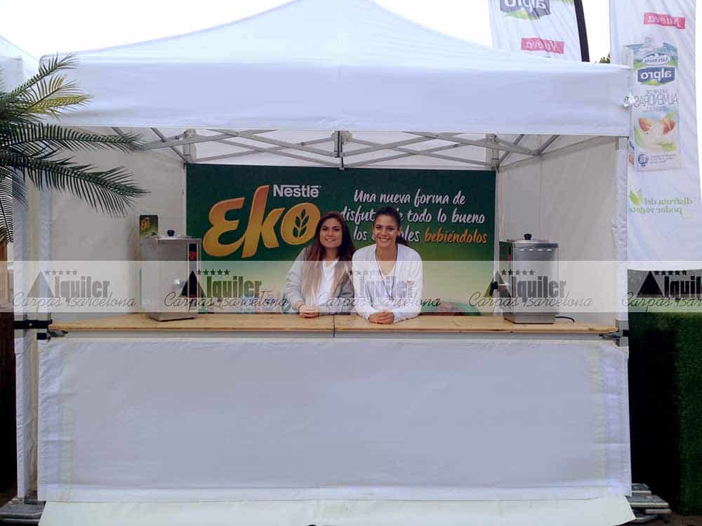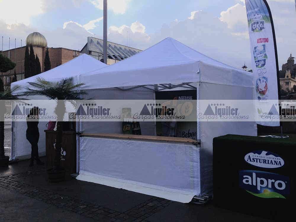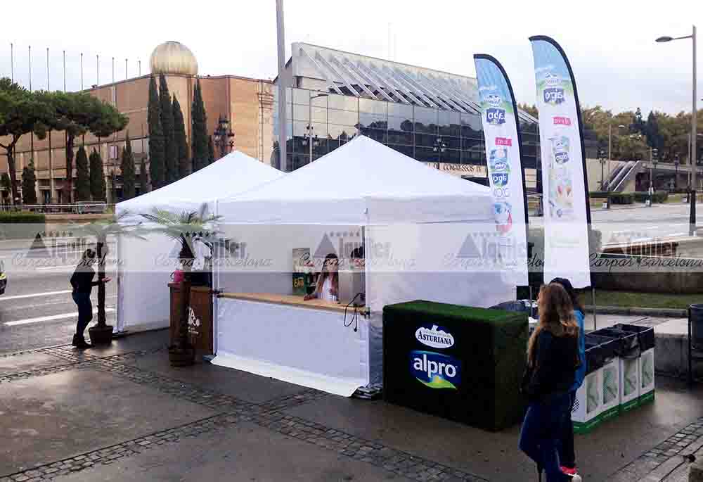 Nuestras carpas de alquiler también pueden incorporar mostradores, para la correcta y profesional atención al público. Este es uno de los casos, en la Avinguda María Cristina de Barcelona montamos varias de nuestras carpas de 3×3 de alquiler. Unas para atención al público, guardarropía o para entrega de regalos o muestras, todas equipadas con mostrador. Otras para almacén, para la organización de esta prueba deportiva.