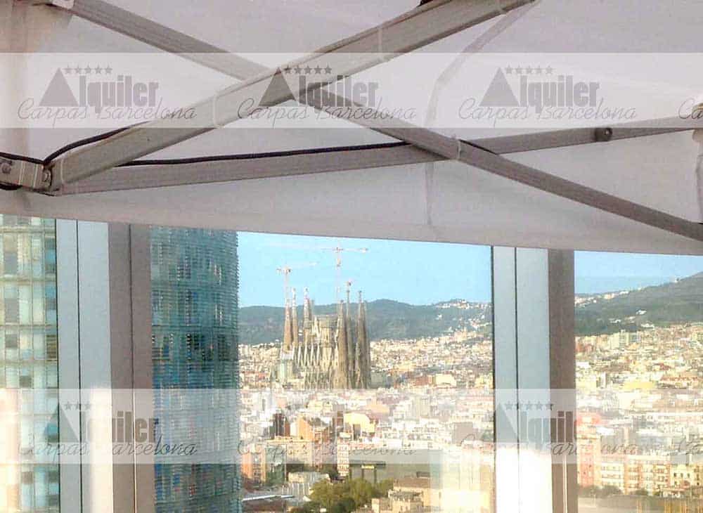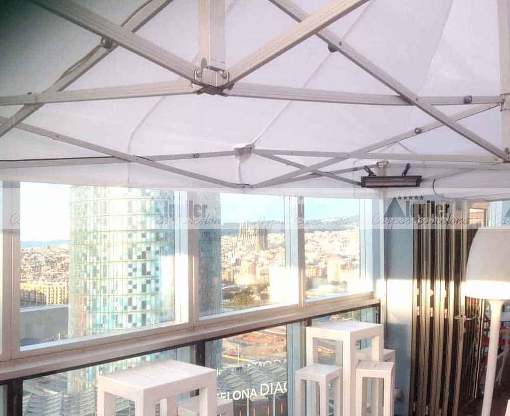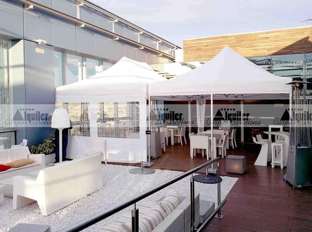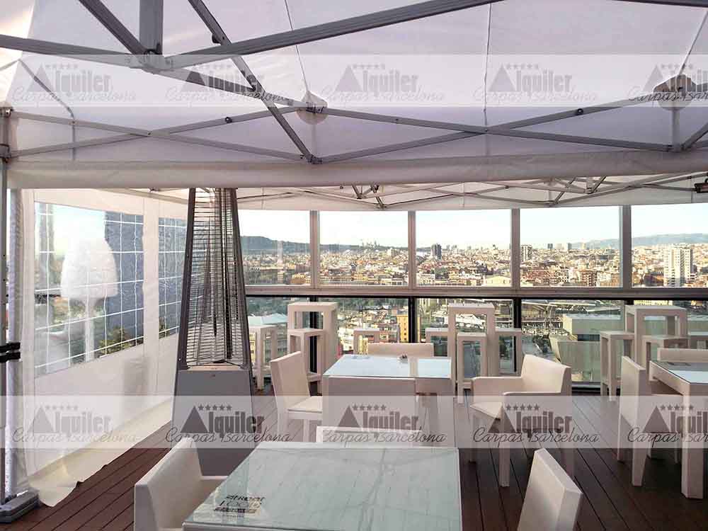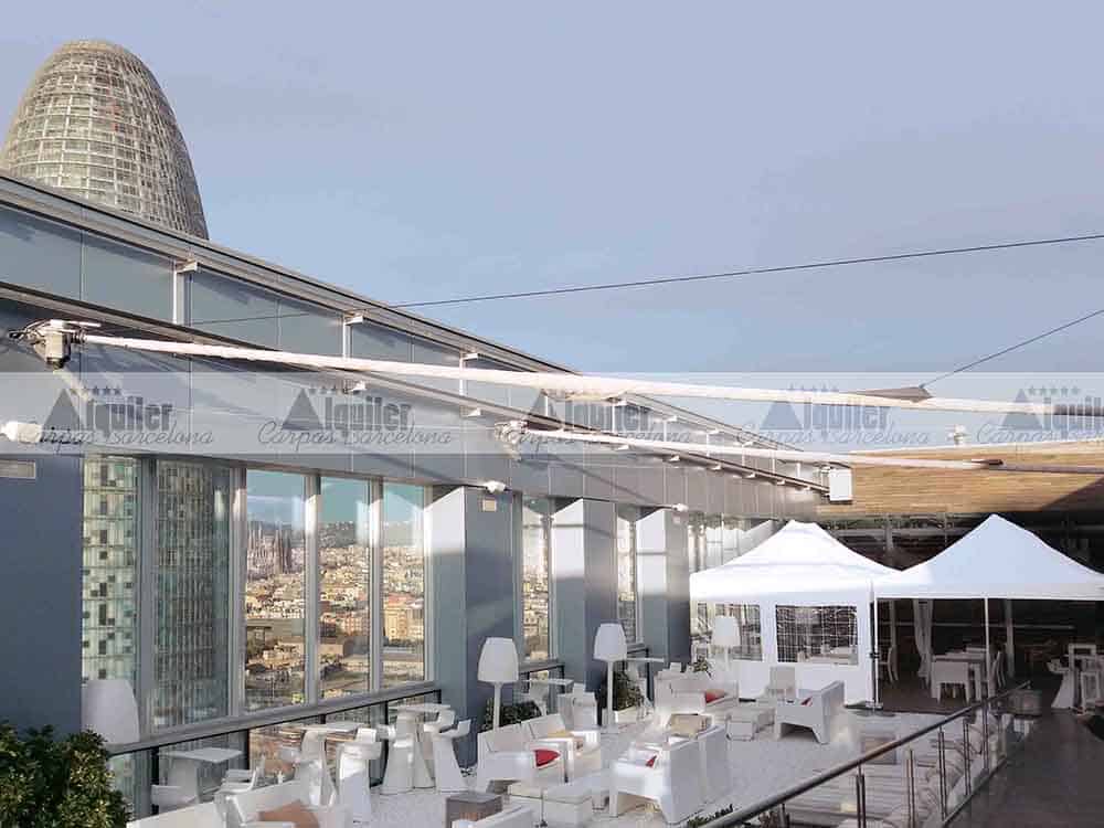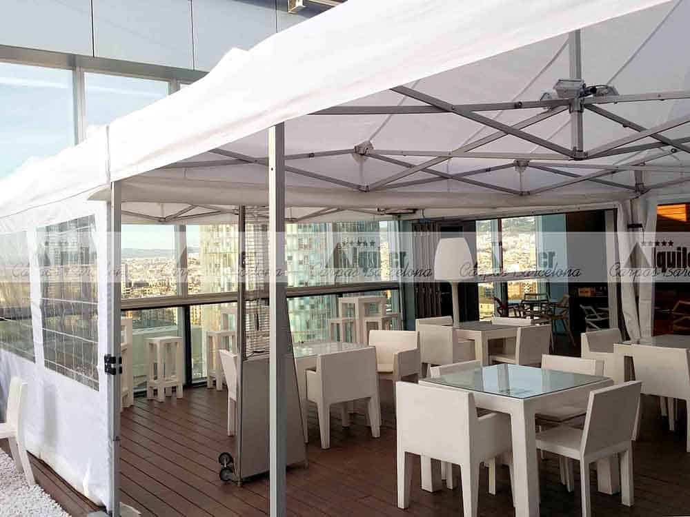 En este hotel, con unas privilegiadas vistas de la ciudad de Barcelona, montamos esta carpa modular de 8x6m. Este espacio, compuesto de dos carpas plegables de 4x6m QT S-45, dio cobertura a los asistentes a un acto de gala. El servicio de catering quería tener la seguridad que el tiempo no estropearía la fiesta, y optó por la seguridad de nuestras tiendas plegables de alquiler.