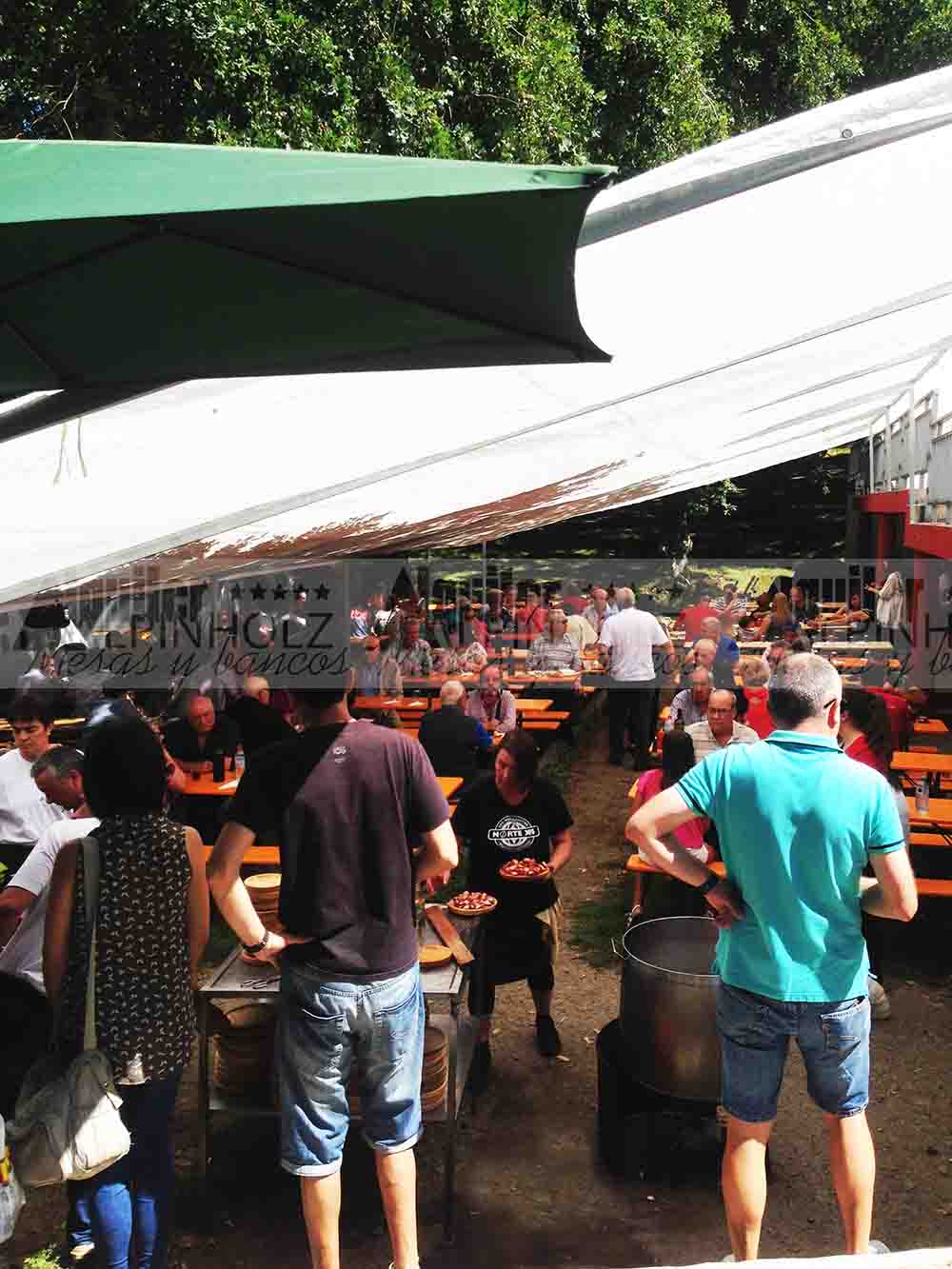 Que bien se lo pasan los asistentes a esta fiesta pulpera, con nuestras mesas y bancos plegables de alquiler como parte de la fiesta. Unas fiestas muy arraigadas en Galicia, que mueven a mucha gente, a las cuales hay que ofrecerles un buen acomodo.