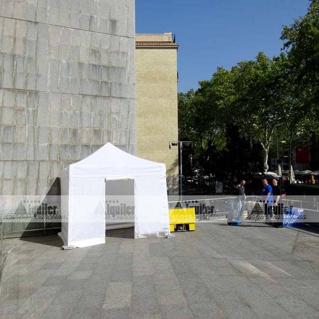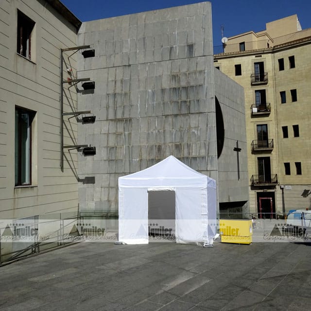 Para un evento cultural en el Centre Cultural Arts Santa Mónica, en las Rambles de Barcelona, montamos este espacio. Una carpa plegable de alquiler destinada para backstage para un evento cultural. Los artistas necesitaban un espacio seguro y cerrado, y con acceso directo a la zona del acto. Nuestra carpa de 3x3m de alquiler fue el perfecto camerino.