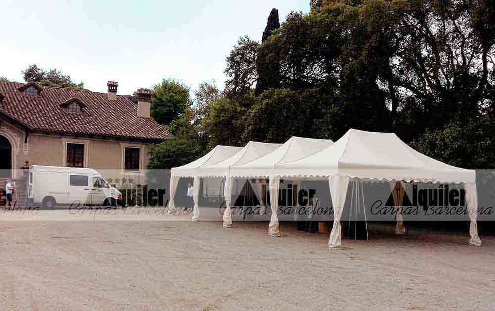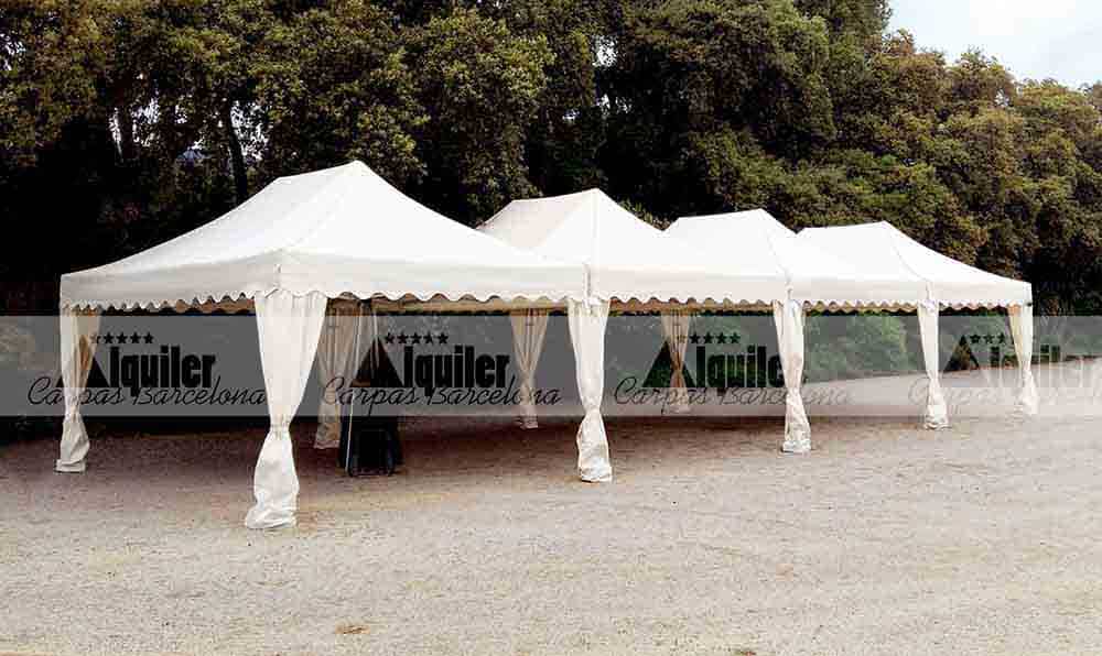 Un montaje modular compuesto por cuatro carpas de 6x4m de alquiler, del modelo Exclusive. Esta serie se caracteriza por su color crema y los faldones ondulados, así como los cubrepuntales en el mismo color. Además, este tipo de montajes refuerzan la seguridad de la estructura.