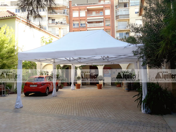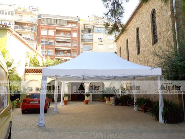 Dos carpas plegables de 6x4m unidas entre si, formando este espacio diáfano de 8x6m. Con la inclusión de cubre puntales para las patas, embelleciendo el módulo, además de cubrir las peanas de seguridad. Podemos añadir calefacción e iluminación en cada montaje si así es solicitado.