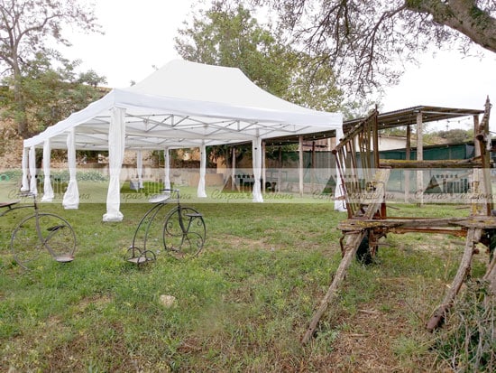 Unas carpas que casan a la perfección con el entorno, cuidando entregar un material limpio y cuidado. Además ofreciendo una tensión de las lonas que refuerza la sensación de robustez que de por si tienen nuestras carpas. Un material fuerte para estar tranquilo durante su celebración.