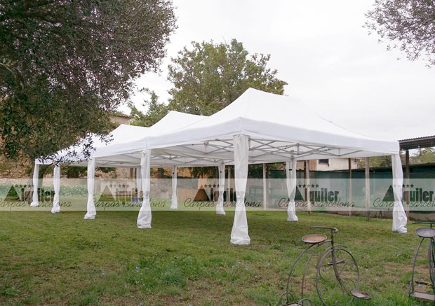 Un día lluvioso o con un sol de justicia no puede fastidiar una gran celebración. Para ello, que mejor que contar con nuestras carpas plegables de alquiler para el gran día. Aquí presentamos un montaje diáfano de 6x16m, construido con cuatro carpas de alquiler de 4x6m.