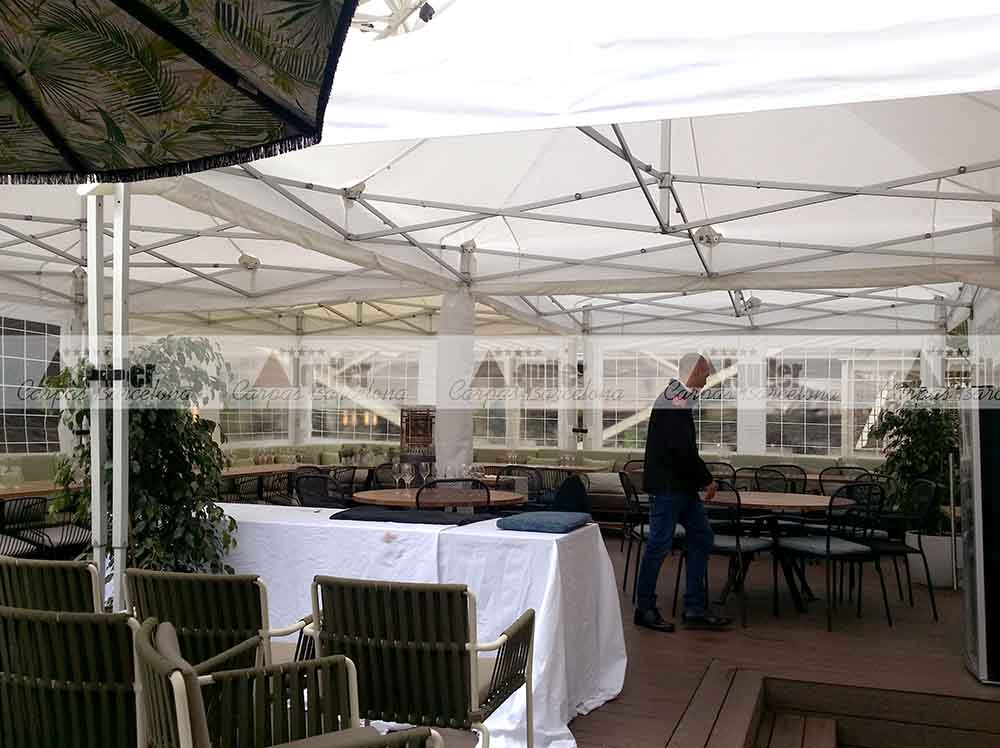 En esta ocasión, nos presentamos con varias opciones, acorde a lo que el cliente nos pedía. Y la decisión final, según el espacio fue montar, con cuatro carpas plegables de 4x4m, este espacio diáfano de 8x8m. El montaje modular proporciona el espacio necesario, además de ofrecer toda la seguridad.