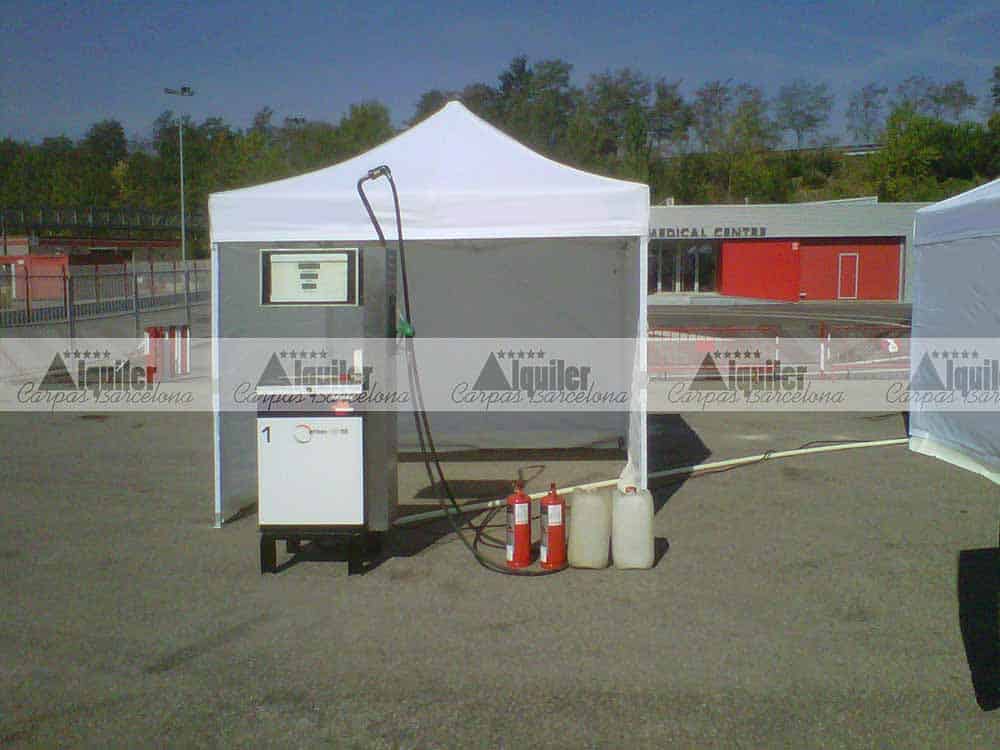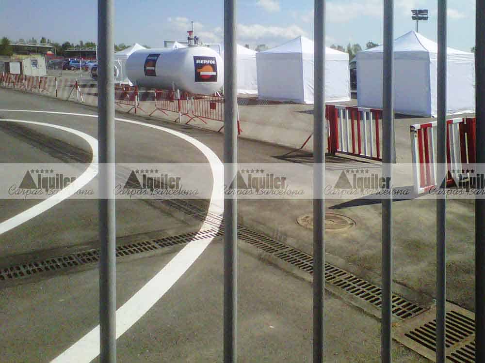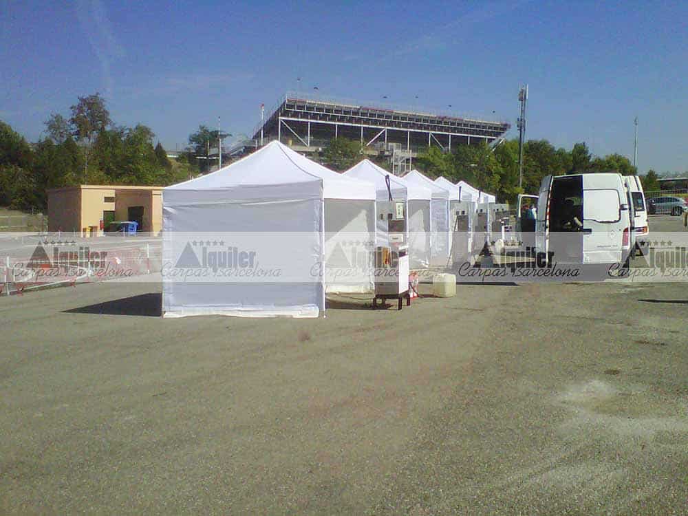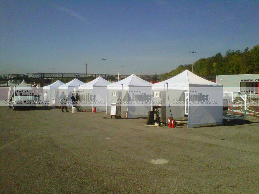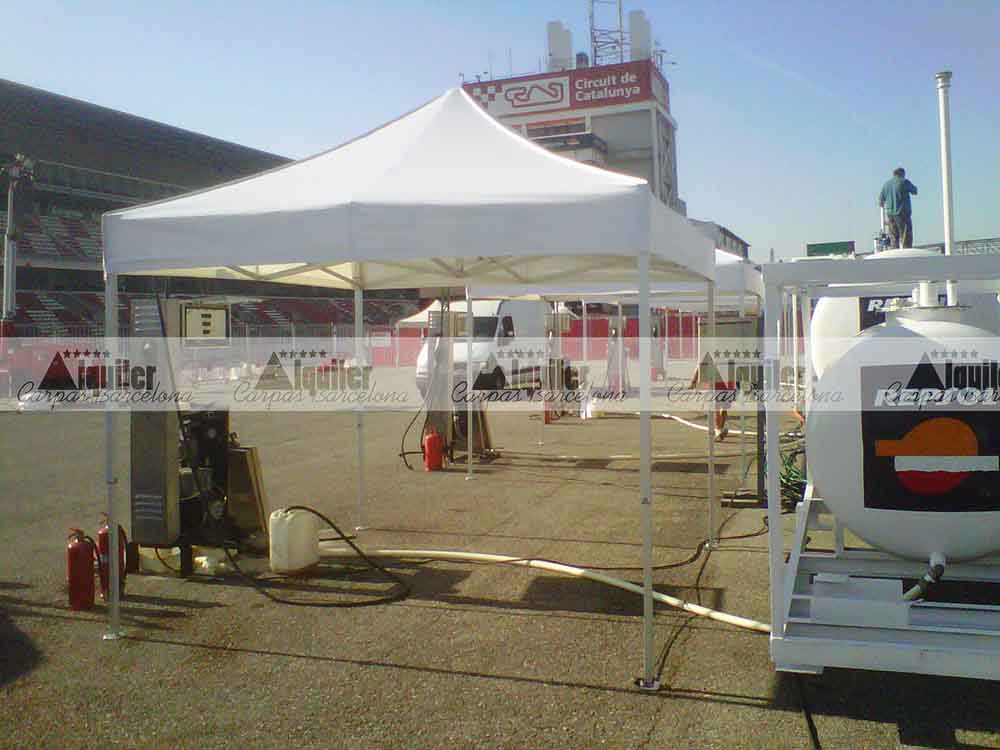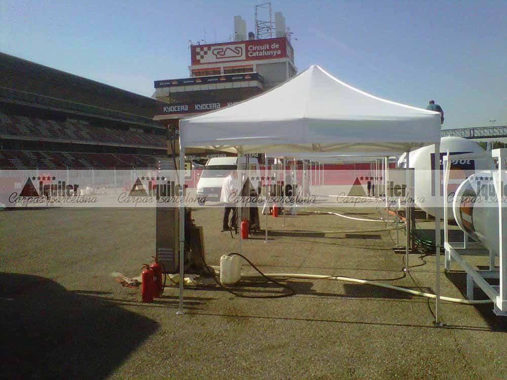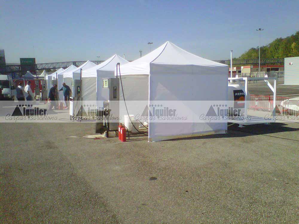 Estas carpas plegables de 3x3m de alquiler se montaron en el Circuit de Barcelona. Fueron usadas como punto de repostaje para un competición de resistencia. Las carpas de alquiler dieron cobijo a los miembros de cada equipo participante en cada pit stop.
