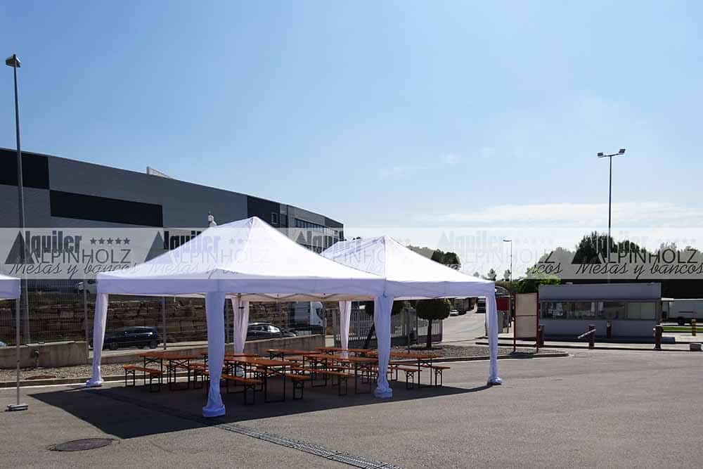 En esta, mundialmente famosa empresa, montamos nuestras mesas y bancos plegables de madera de alquiler. Fue en el marco de unas jornadas para la familia, y debajo de estas carpas, se montó un punto para juegos infantiles.