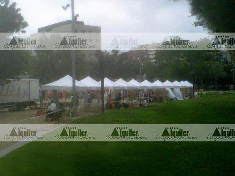 Varias de nuestras carpas de alquiler instaladas en un parque de Barcelona. Las carpas de 3x3m sirvieron para dar cobijo a varias asociaciones, en un domingo que amenazaba lluvia. Todos los techos de nuestras carpas son 100% impermeables permitiendo la tranquilidad de nuestros clientes en todo momento.