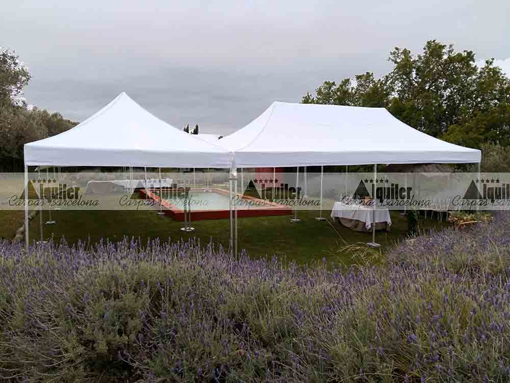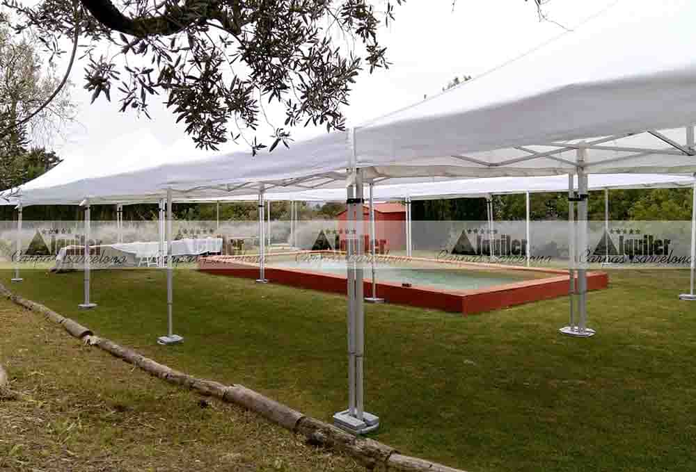 En esta fiesta particular nos solicitaron rodear esta piscina, y así proteger del sol a los asistentes. Nos pusimos manos a la obra con nuestras carpas plegables de alquiler de 4x8m S45. Este modelo es, sin duda, el más robusto del mercado, y si las unimos, se convierte en un módulo compacto y seguro.